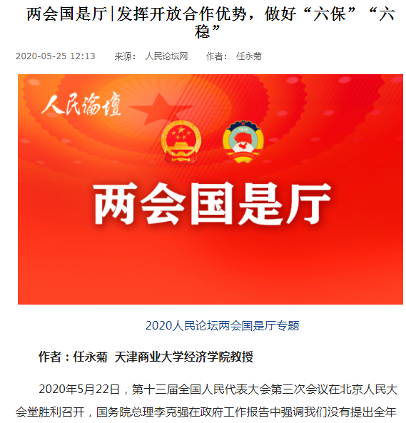 任永菊教授理论文章“发挥开放合作优势,做好‘六保’‘六稳’”。文章指出,2020年5月22日,第十三届全国人民代表大会第三次会议在北京人民大会堂胜利召开,国务院总理李克强在政府工作报告中强调我们没有提出全年经济增速具体目标,主要因为全球疫情和经贸形势不确定性很大,我国发展面临一些难以预料的影响因素。文章主要从“发挥自贸(试验)区创新优势,以‘稳外资’带动‘稳外贸’”、“发挥经济开发区集聚优势,以‘先进制造业’带动‘高端服务业’”、“发挥开放合作区区位优势,以‘一带一路’带动‘全球产业链供应链’”等三个方面阐述自贸(试验)区、经济开发区以及开放合作区等在我国经济社会发展过程中占据举足轻重地位的开放合作平台,在“后疫情”时期,如何发挥它们各自的差异化优势,抓好“六保”工作,进一步推动我国经济实现高质量发展,维护社会稳定。