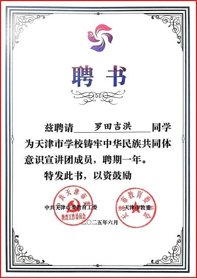为贯彻落实党的二十届三中全会精神和习近平总书记在全国民族团结进步表彰大会上的重要讲话精神,日前,市教育两委公布天津市第三批学校铸牢中华民族共同体意识宣讲团成员名单,我院2022级本科生罗田吉洪成功入选。