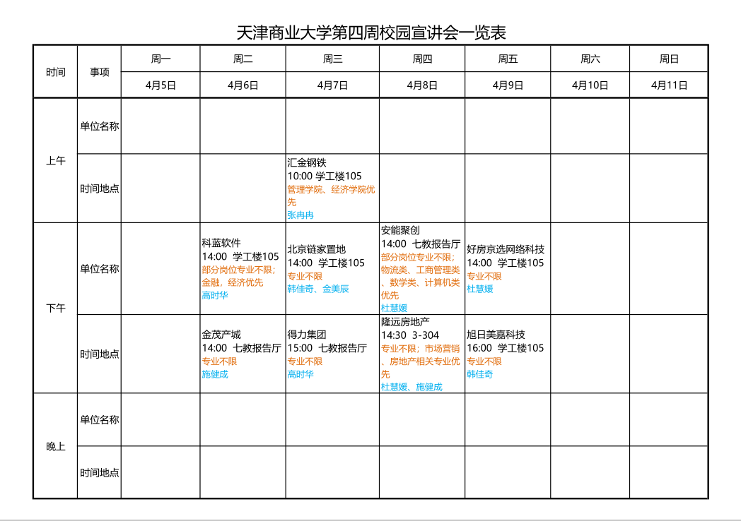 为向天商学子传达相关组织、团体或企业的情况、文化价值观、人力资源政策、校园招聘的程序和职位介绍等信息,接下来的第四周所举办招聘会的相关信息如下。