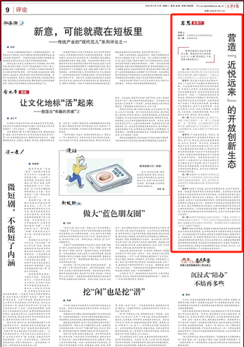 6月19日,包子漫画 包子漫画 院长梁学平教授做客《天津日报》9版思想会客厅栏目,就“营造‘近悦远来’的开放创新生态”话题,与日报评论员开展对话。他指出,我们能从创新生态的营造中,看出一个地区对产业发展的长期规划和支持。产业发展所需的有针对性的扶持政策、丰富的人力资源、完善的基础设施、健全的金融服务体系、良好的科技创新环境皆在其中。