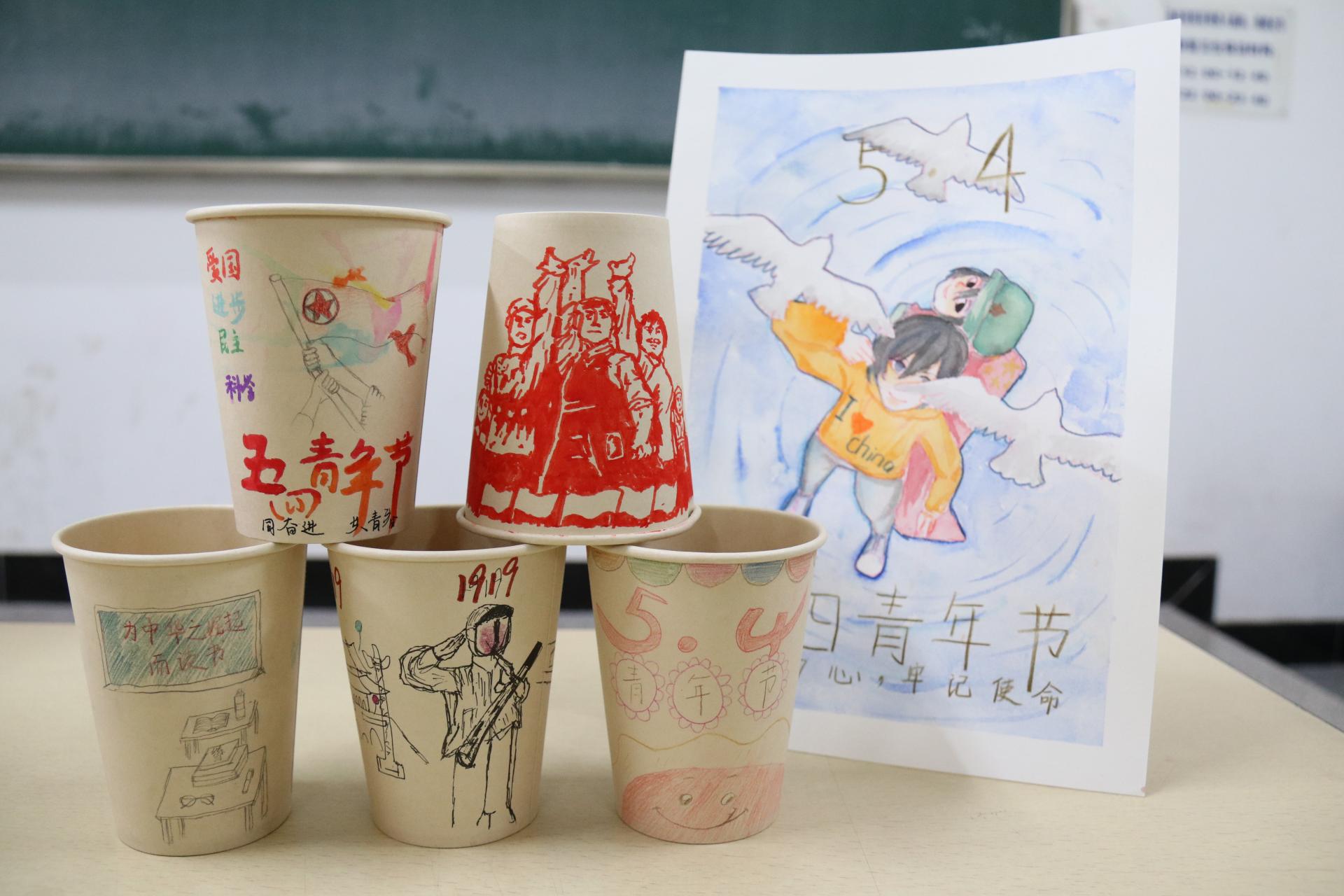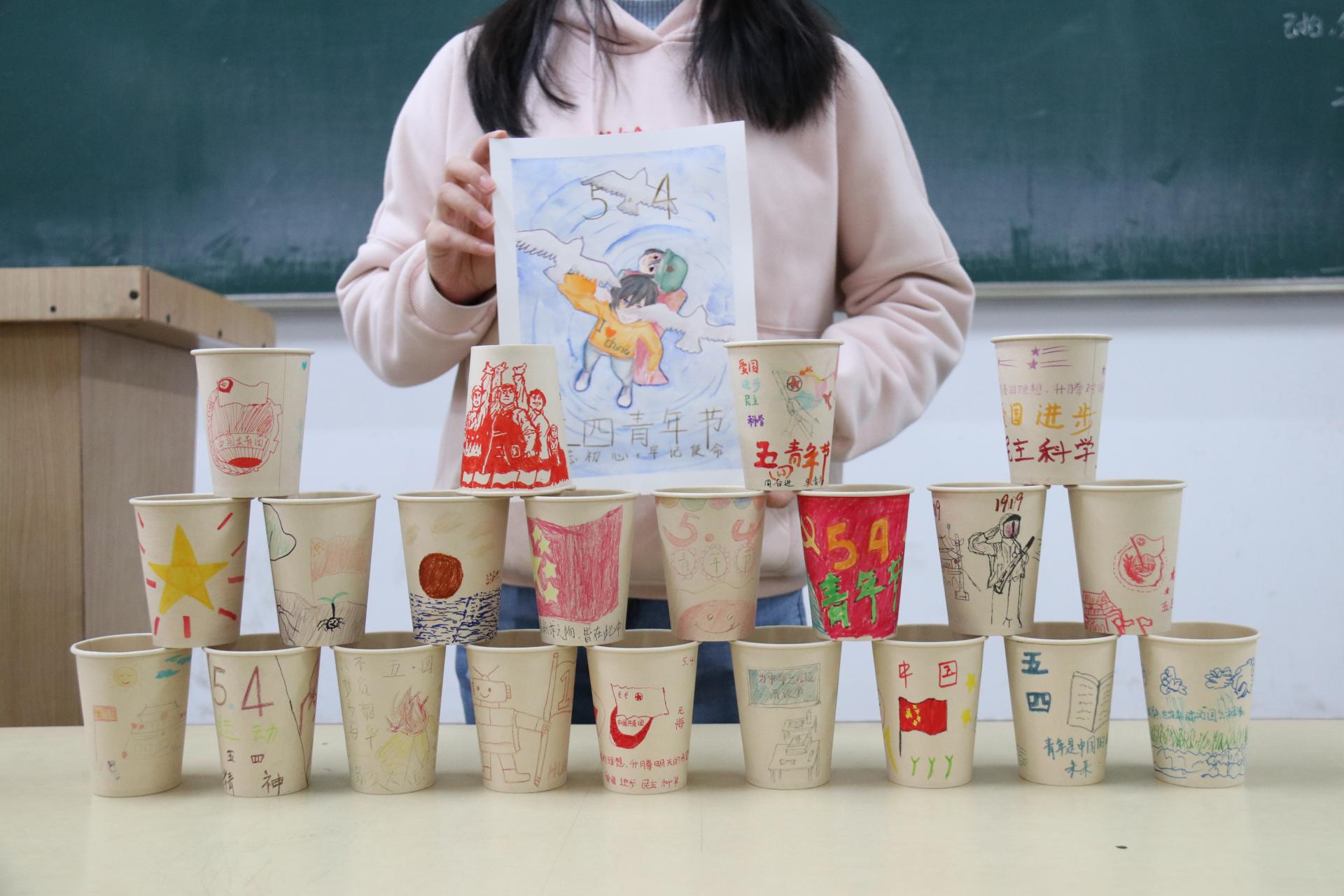 活动分为三个环节,第一环节“奉以长者期,感以烈士魂”,国贸系辅导员张文文、学生会主席白龙翔讲述五四精神,引导学院团员青年,学烈士之体魄,燃青春之热情。 第二环节“传以五四神,言以青春梦”,参与者每人一张书信纸、一只感情笔,以文字的形式书写所思所感,以语言的方式表述对五四精神的深刻体会、对未来的期望。 第三环节“绘以拳拳心 ,寄以爱国情”通过纸杯和笔的摩擦,参赛同学充分发挥想象力与创造力,运用绚丽的色彩与奇特的造型,将一个个平凡无奇的纸杯,涂鸦成各式各样的创意作品,并对作品构思、内涵进行论证讲述。